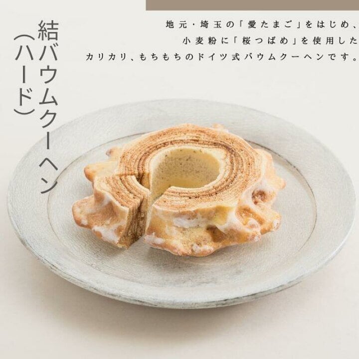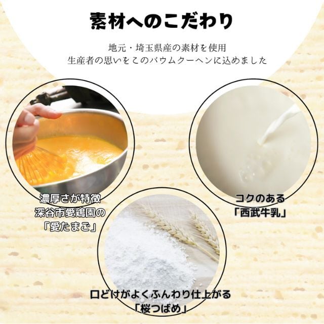 地元・埼玉の「愛たまご」をはじめ、小麦粉に「桜つばめ」を使用したカリカリ、もちもちのドイツ式バウムクーヘンです。