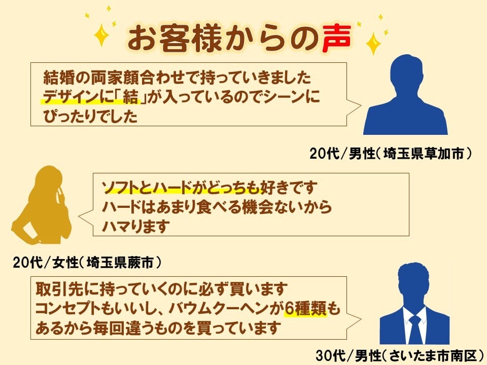 地元・埼玉の素材にこだわった埼玉県産の「愛たまご」をはじめ、小麦粉に「桜つばめ」、牛乳に「西武牛乳」を使用したしっとり、ふわふわのバウムクーヘンです。